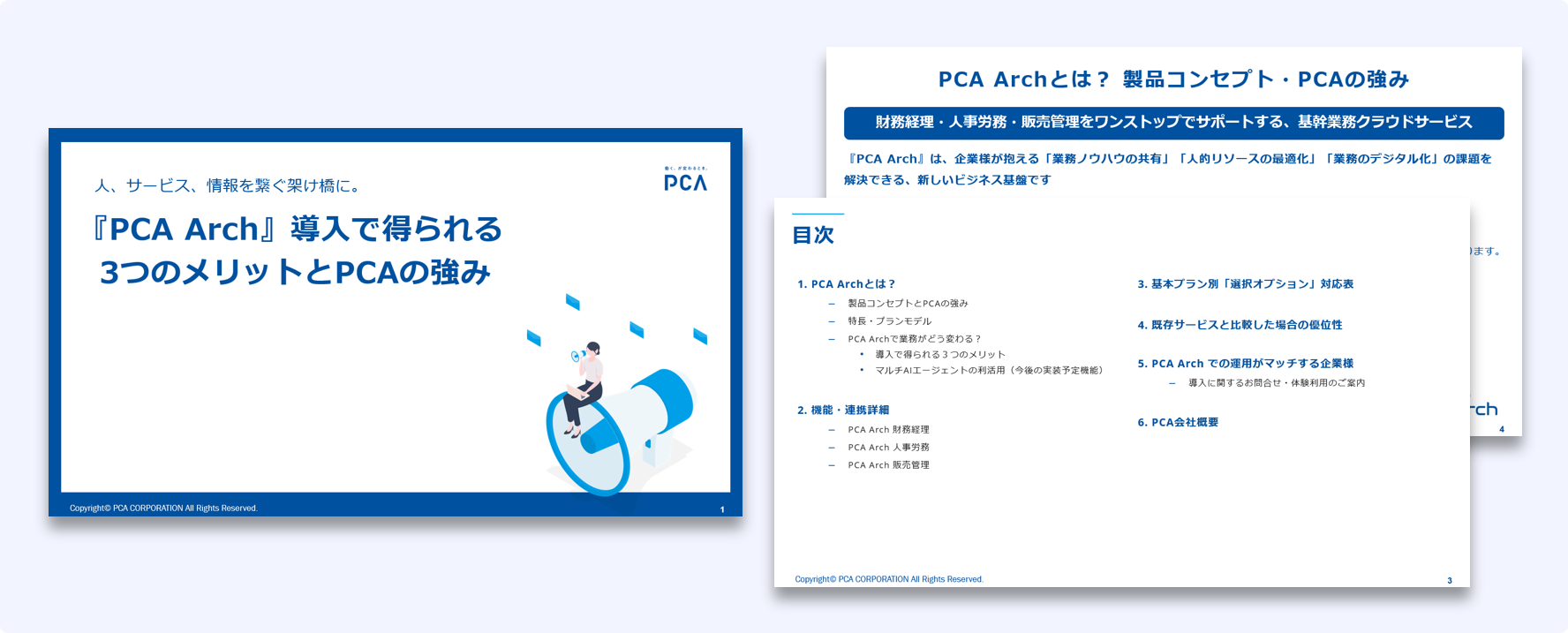 これからの社会を見据え、データの安全性を最大限に確保しながら、人的リソースの担保や効率化をしたいとお考えの方も多いのではないでしょうか。『PCA Arch』は、こうした問題を解決するためのさまざまな特長を持っています。最新の「AIエージェント」技術や基幹業務をより高度に自動化するために、これから目指している構想と展望にもご注目ください。