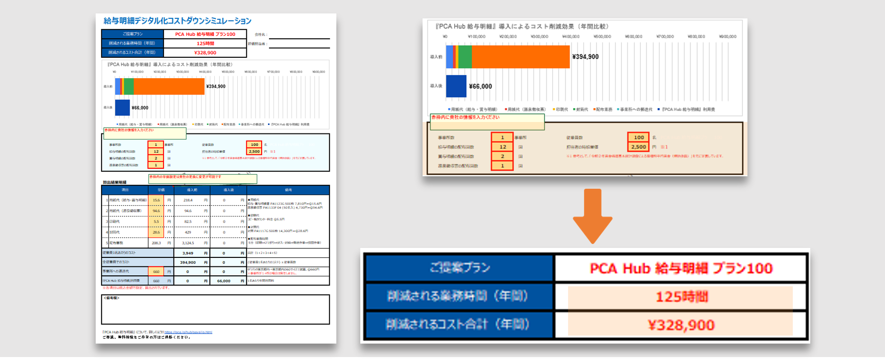 自社情報での詳細なシミュレーションをご希望の場合はフォームからコスト削減試算シート (エクセル) をお申込みください。6項目を埋めるだけで、時間とコストの削減効果をカンタンに算出できます。